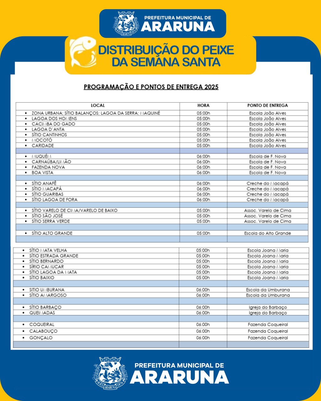 Prefeitura de Araruna realizará tradicional entrega do peixe beneficiando diversas famílias; Confira locais